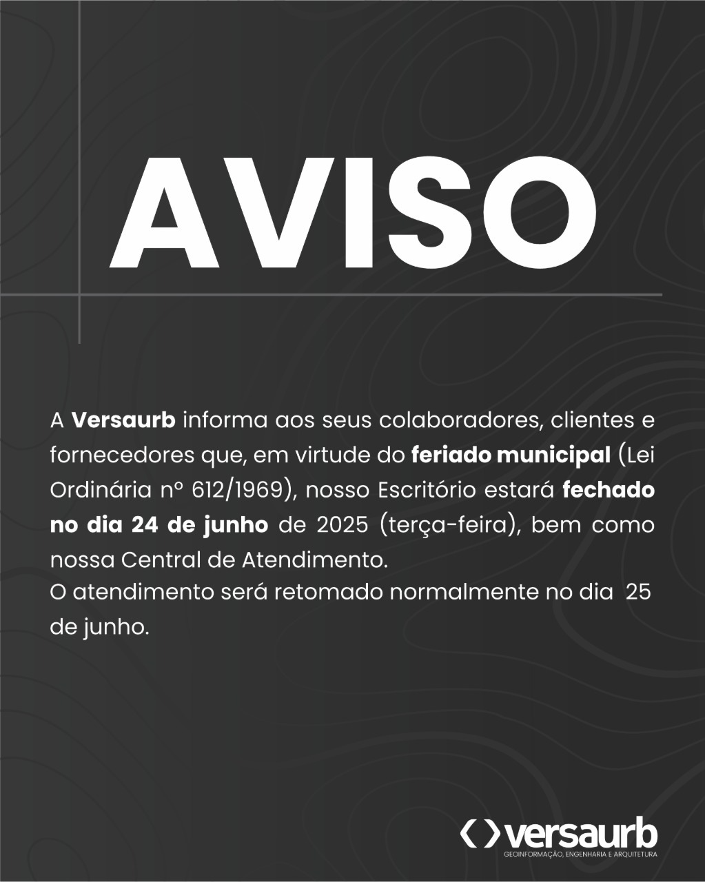 A Versaurb informa que não teremos atendimentos na próxima terça-feira, dia 24/06, devido ao feriado de aniversário de Caratinga.