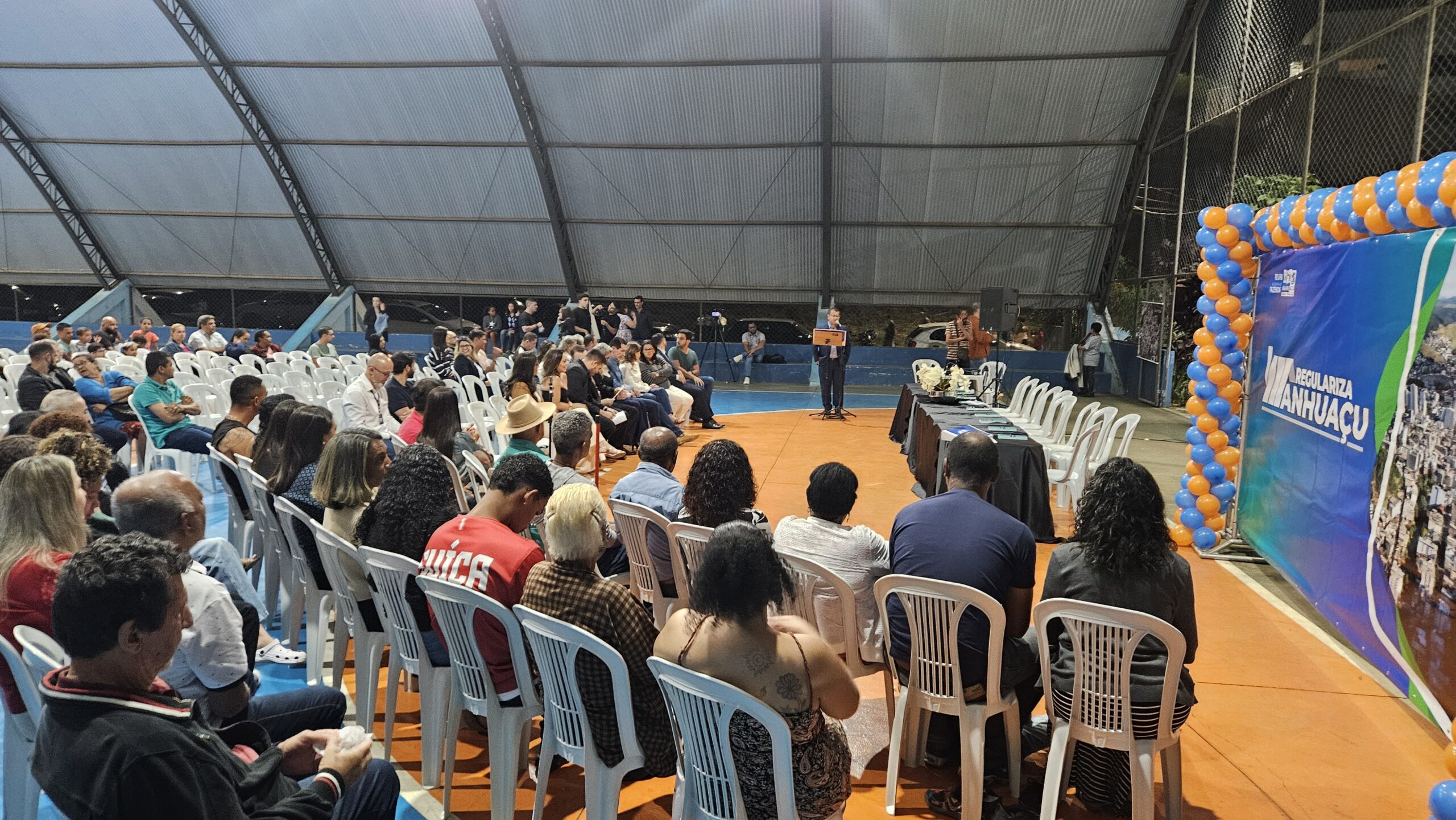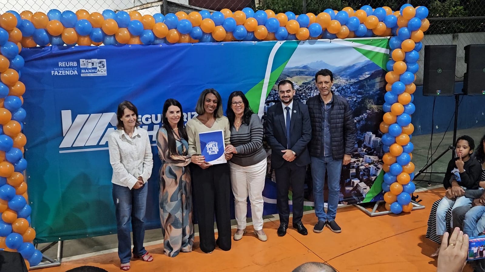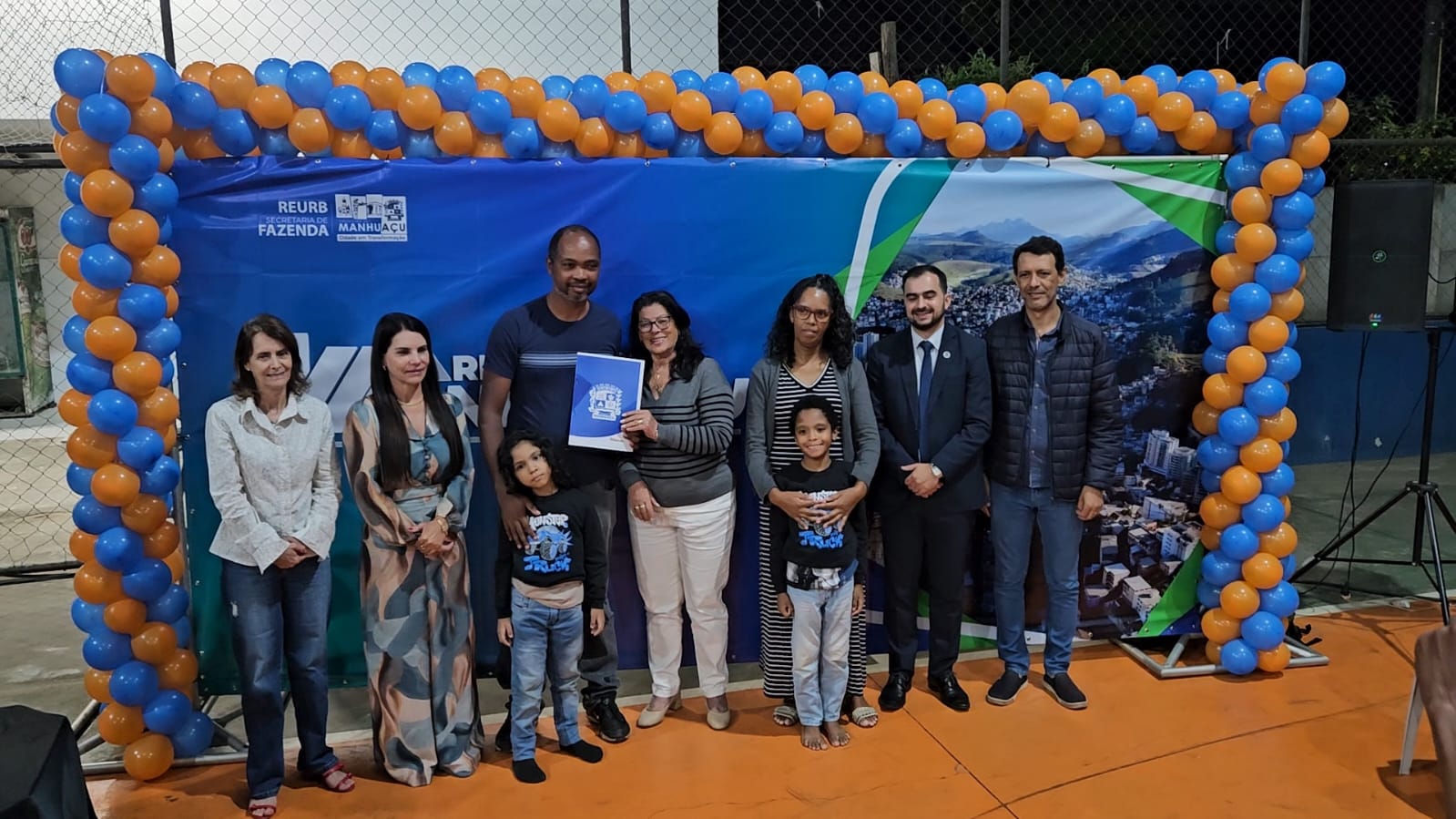 Na fria noite desta quinta-feira (dia 22), a Prefeitura de Manhuaçu aqueceu o coração de dezenas de famílias do bairro Petrina com a entrega das escrituras de seus lotes registradas em cartório, de forma totalmente gratuita. A entrega dos títulos de propriedade dos imóveis aconteceu em solenidade na quadra de esportes do bairro Petrina. Esta foi a primeira entrega de títulos por meio do Programa “Regulariza Manhuaçu”, executado pela empresa Versaurb, cujo objetivo é regularizar mais de 2.350 lotes, das quais, 600 no Petrina.