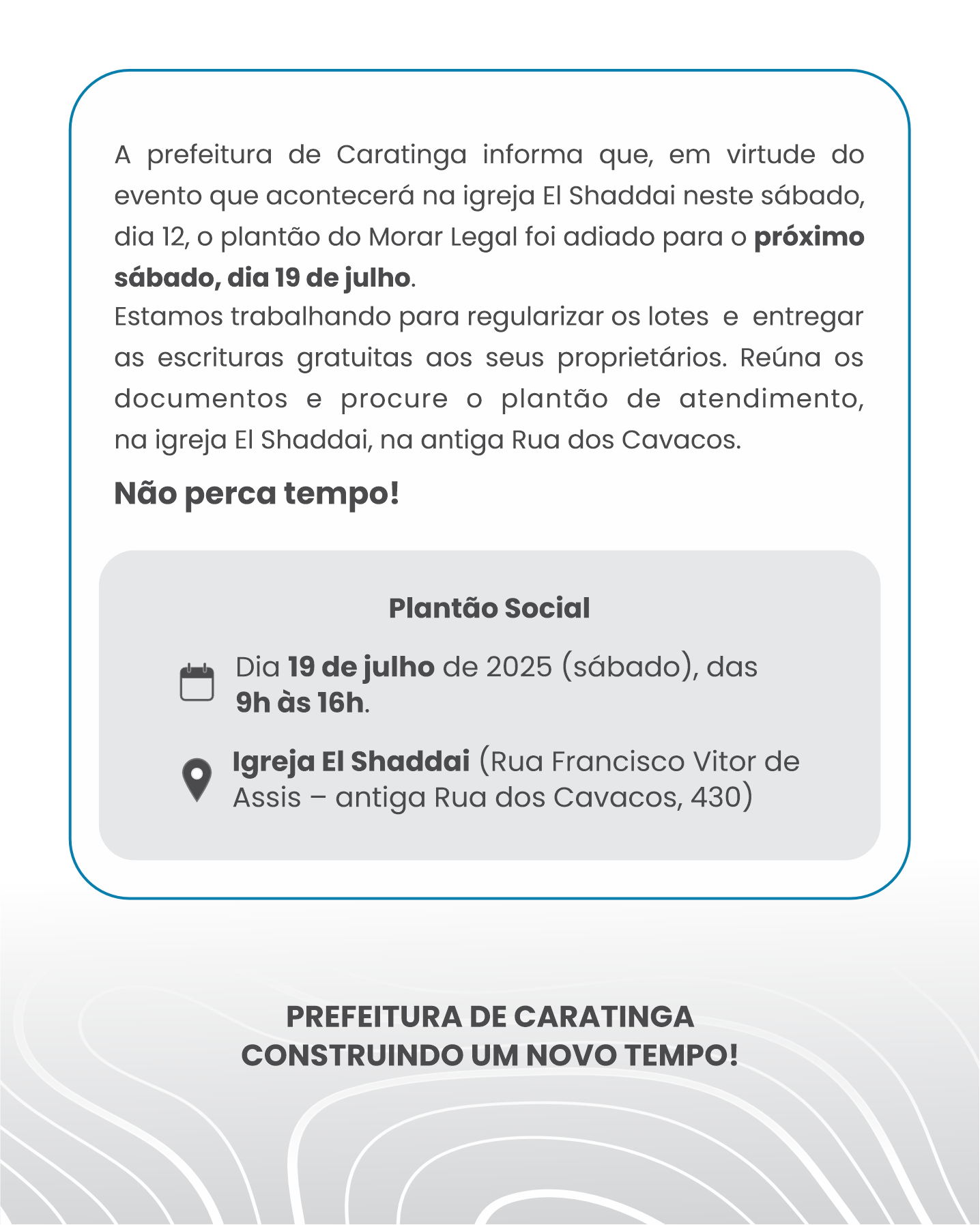 11 de julho de 2025 Atenção moradores do núcleo Sebastião Cirilo Veloso em Caratinga: A prefeitura informa que, em virtude do evento que acontecerá na igreja El Shaddai neste sábado,…