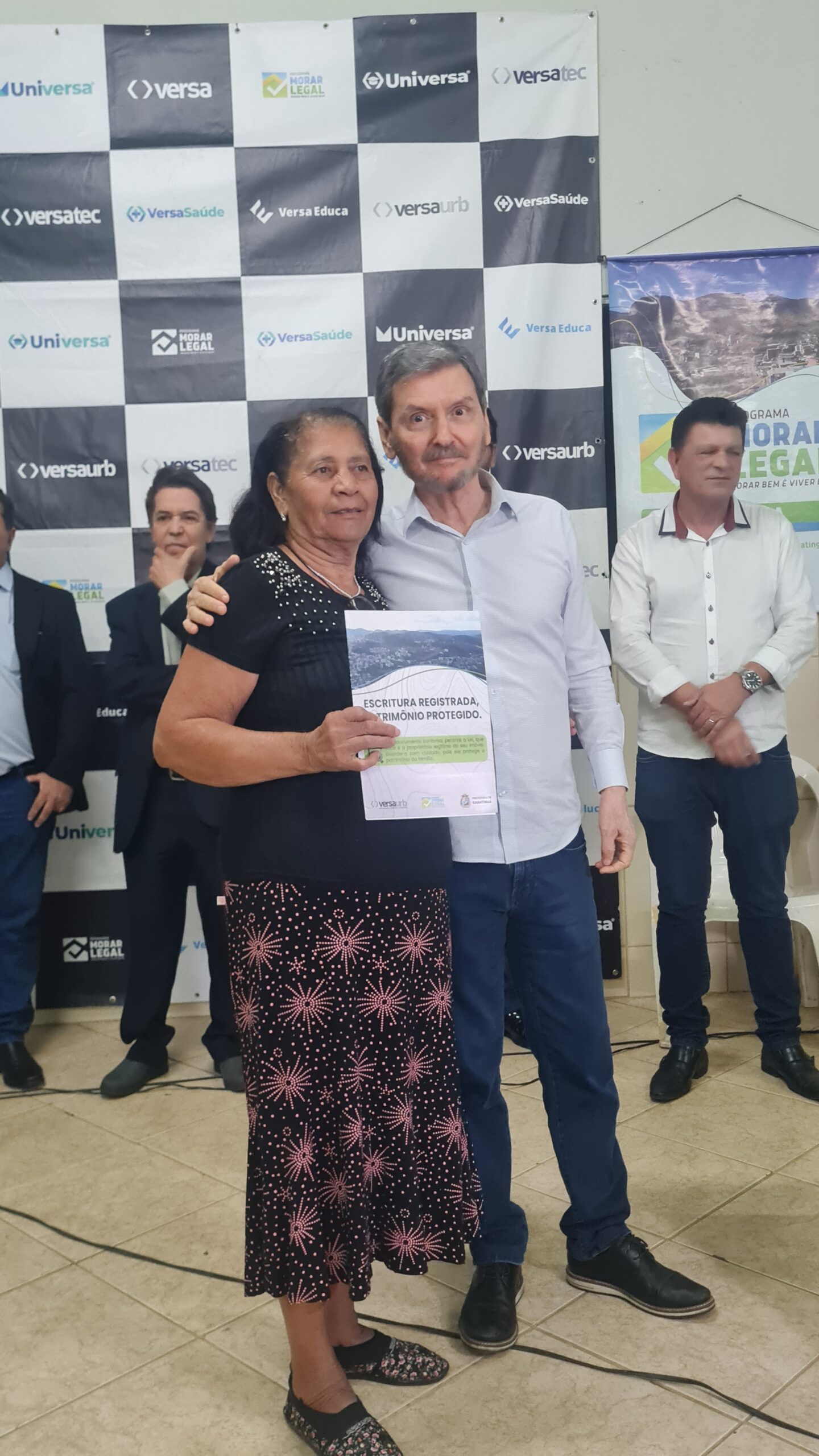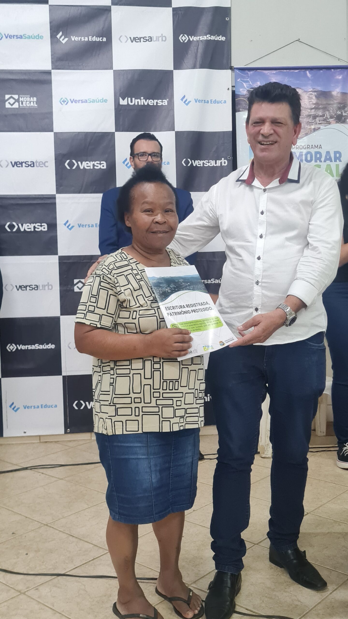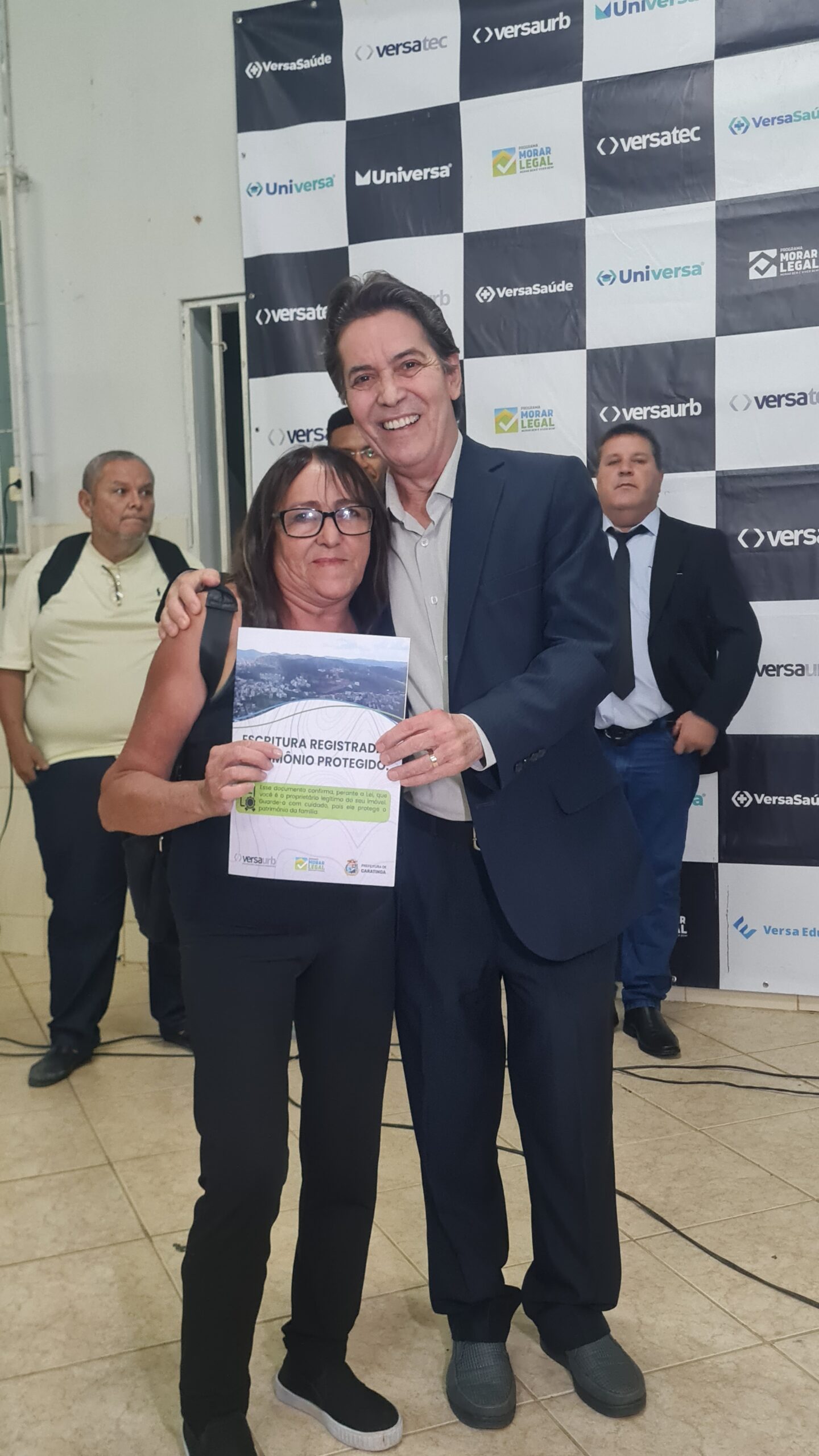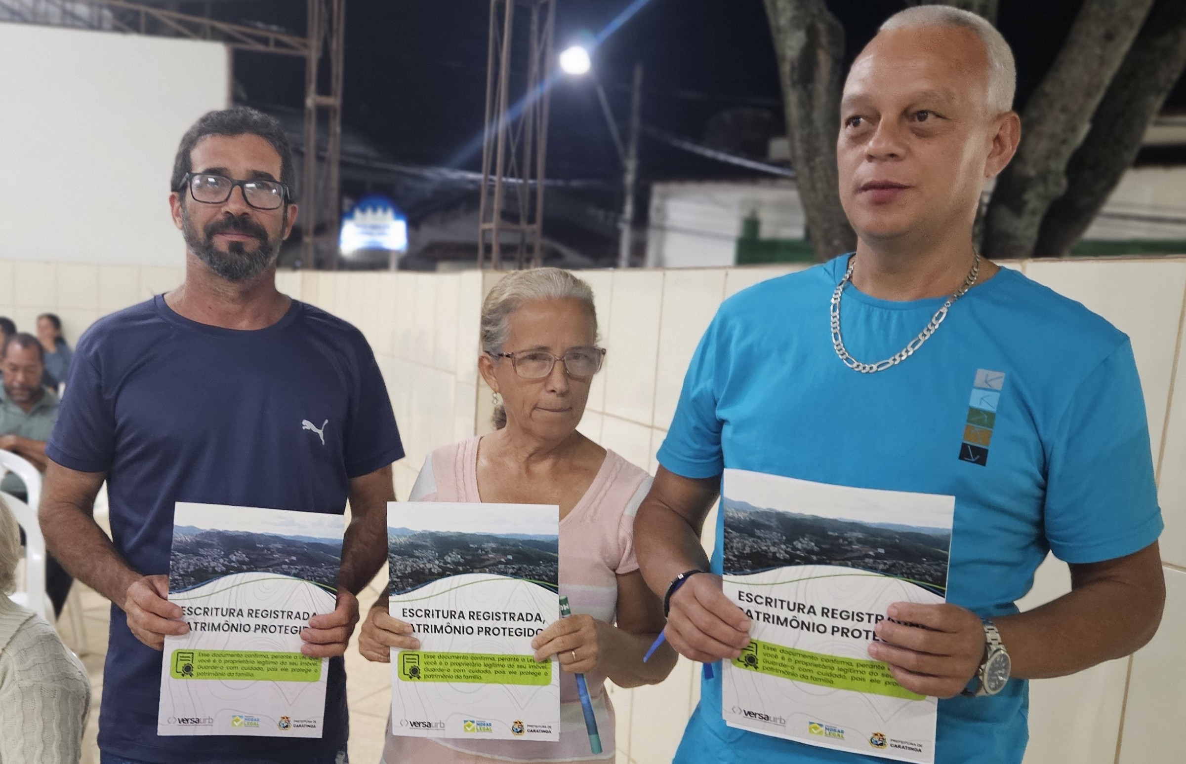 Mais de 100 famílias do bairro Dr. Eduardo receberam as escrituras dos seus lotes registradas em Cartório, sem custo algum. Os títulos de propriedade dos imóveis foram entregues na noite desta segunda-feira (dia 7) pela Prefeitura de Caratinga, em solenidade que lotou o auditório da Fundação Educacional Cidade dos Meninos (Funcime), no bairro Santa Cruz. Até agora, aproximadamente 200 famílias daquela comunidade já foram beneficiadas por meio do programa “Morar Legal”, executado pela empresa Versaurb.