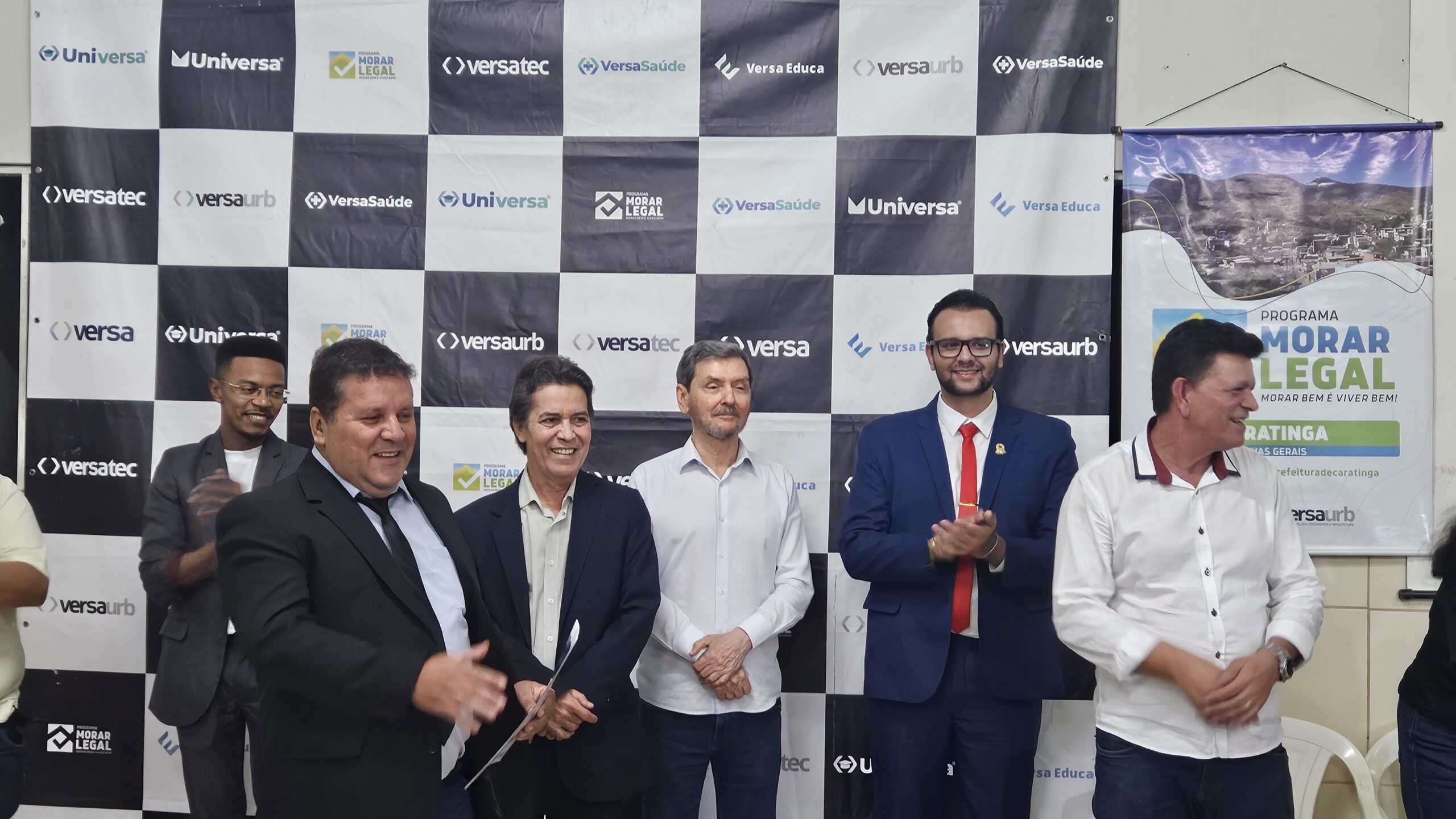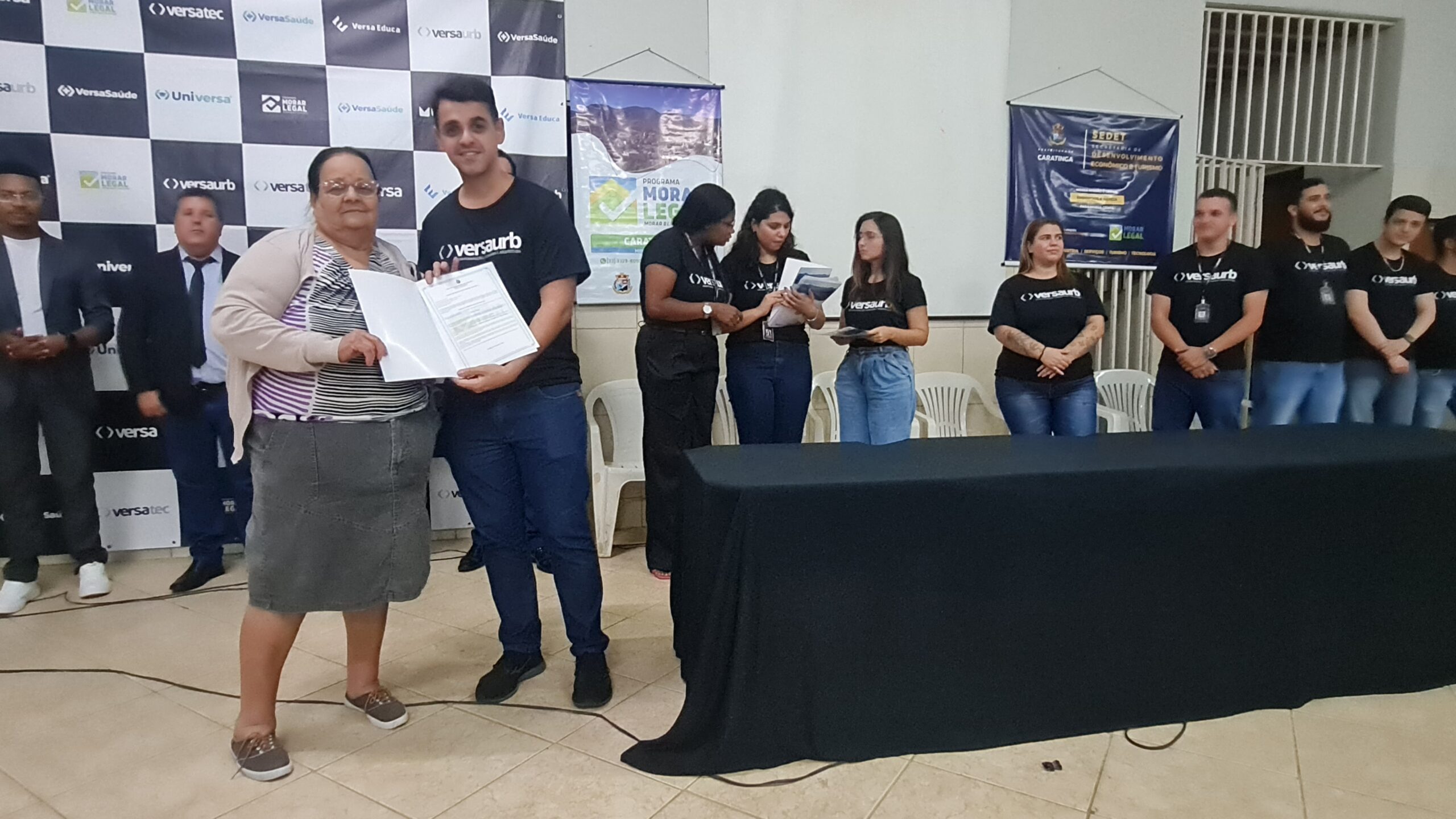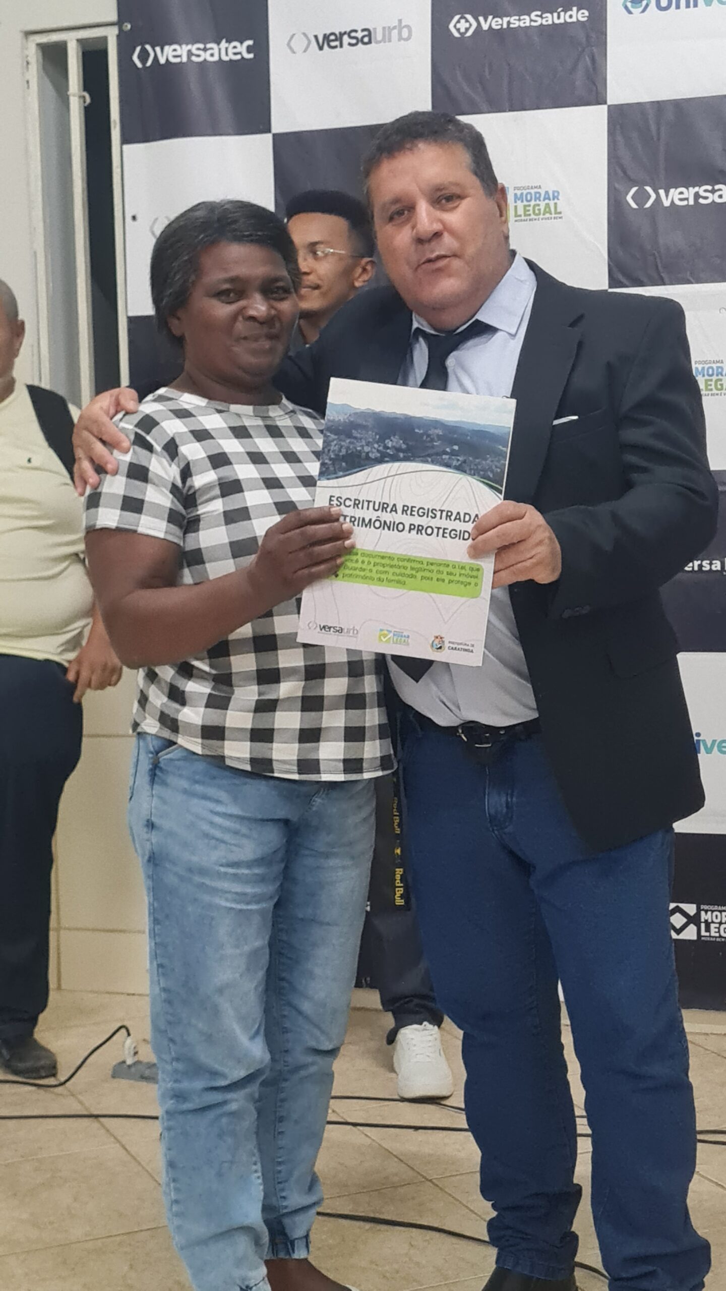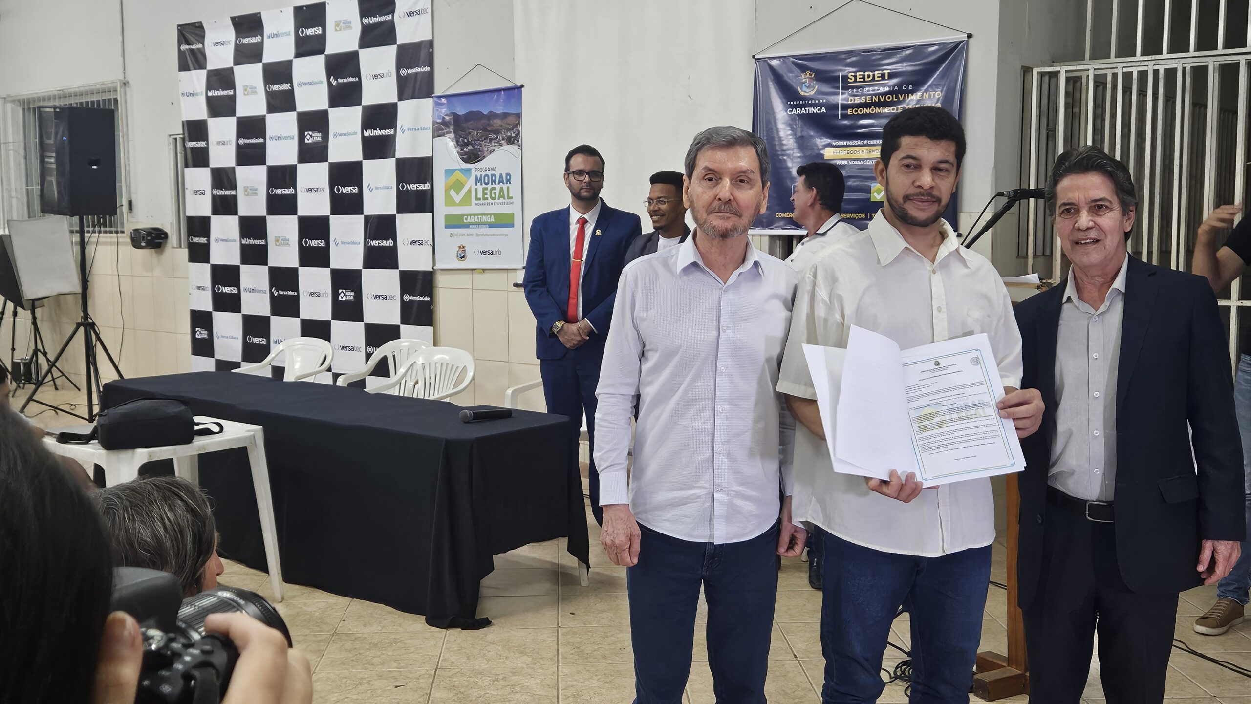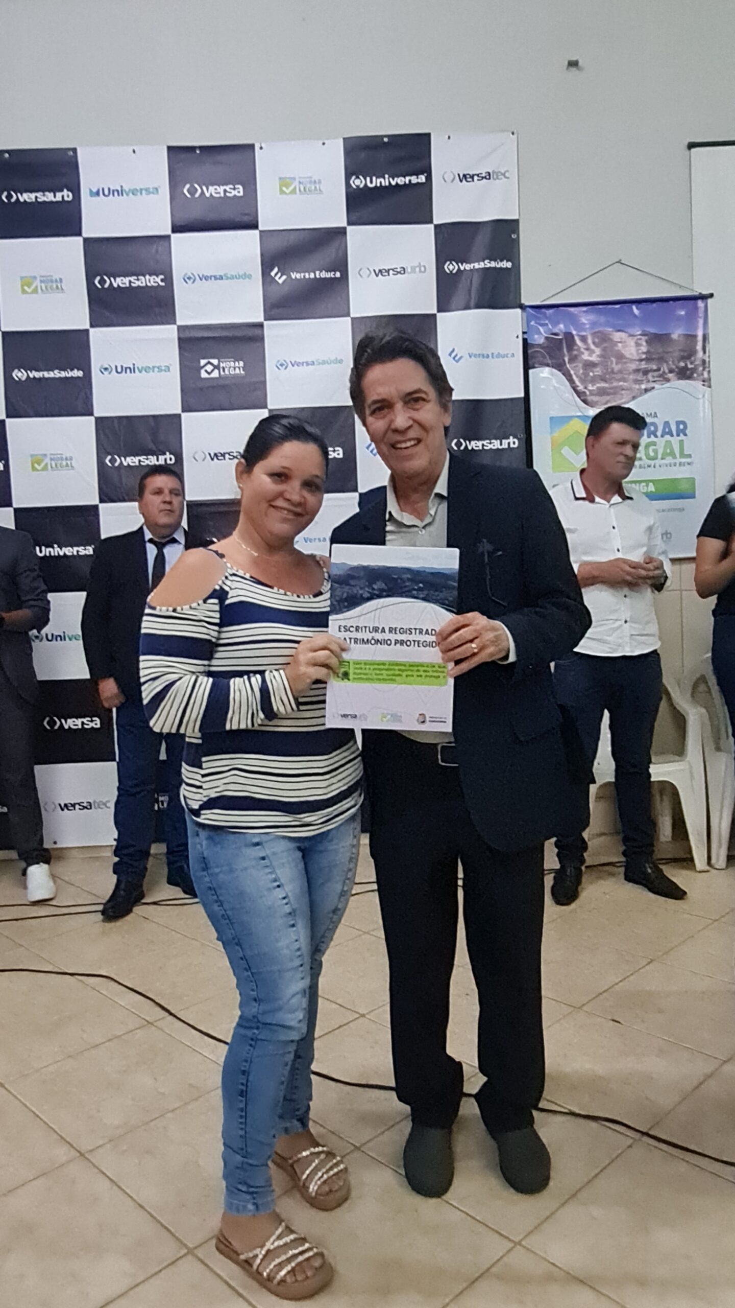 Mais de 100 famílias do bairro Dr. Eduardo receberam as escrituras dos seus lotes registradas em Cartório, sem custo algum. Os títulos de propriedade dos imóveis foram entregues na noite desta segunda-feira (dia 7) pela Prefeitura de Caratinga, em solenidade que lotou o auditório da Fundação Educacional Cidade dos Meninos (Funcime), no bairro Santa Cruz. Até agora, aproximadamente 200 famílias daquela comunidade já foram beneficiadas por meio do programa “Morar Legal”, executado pela empresa Versaurb.