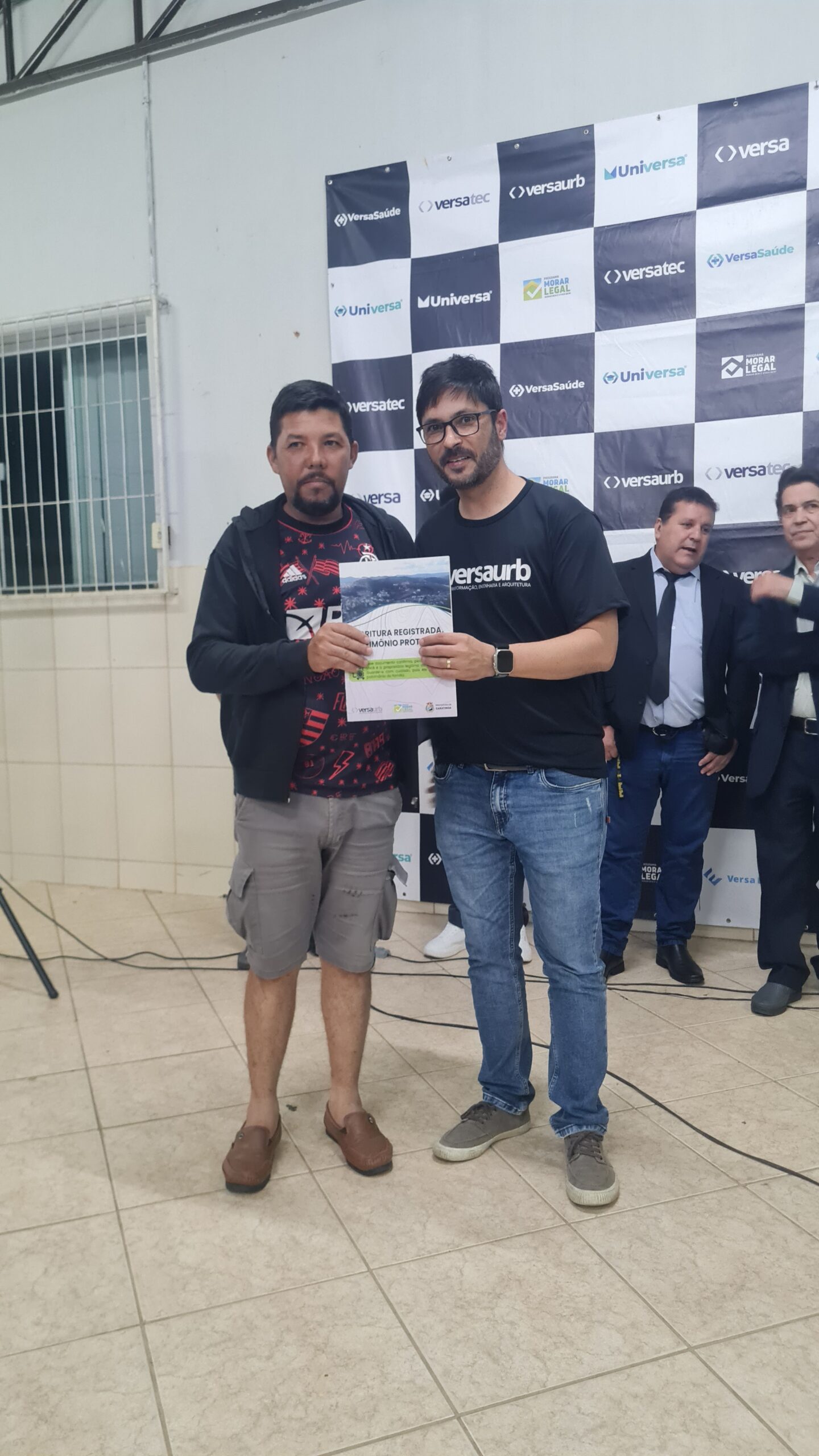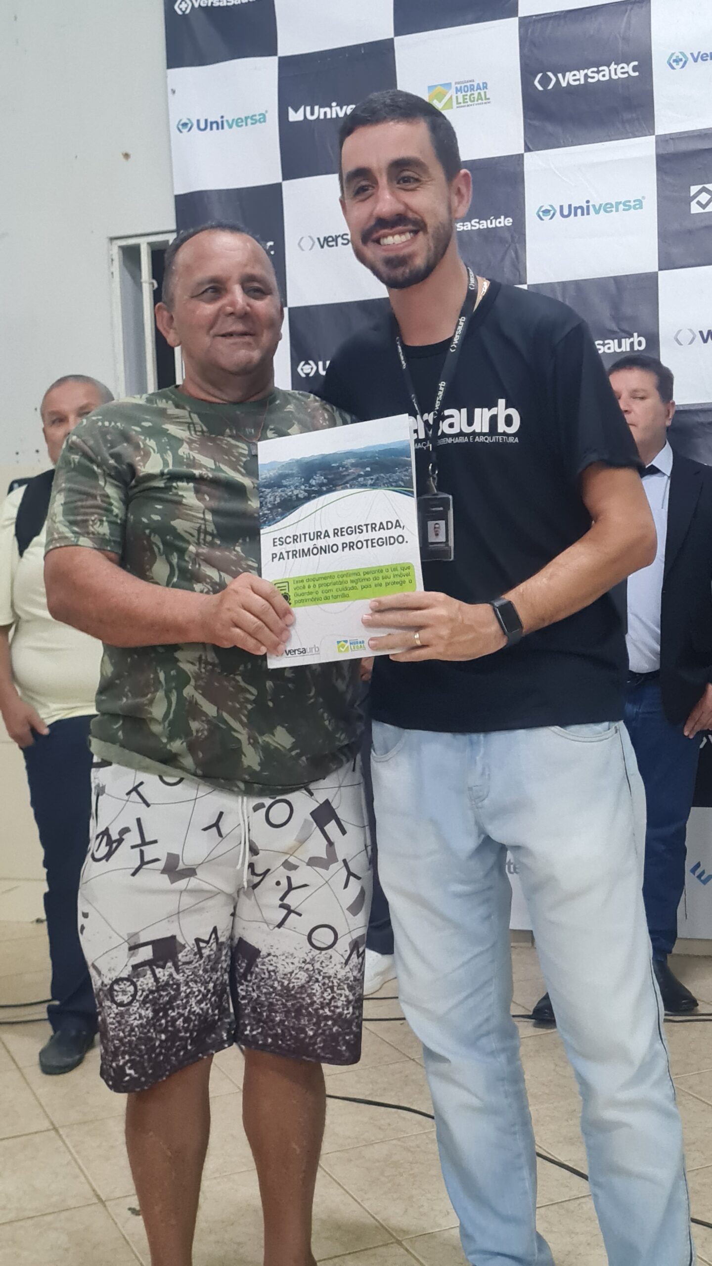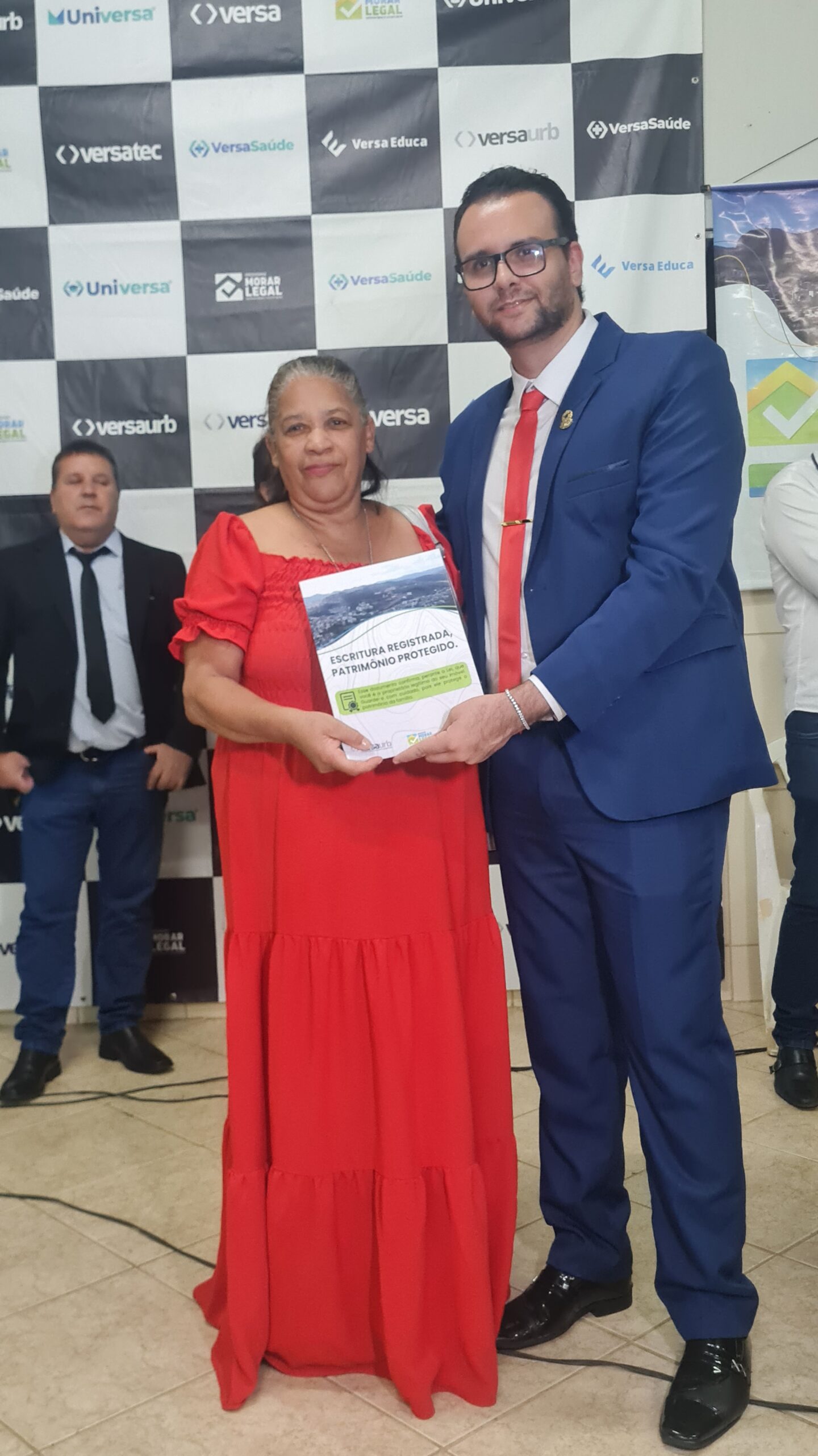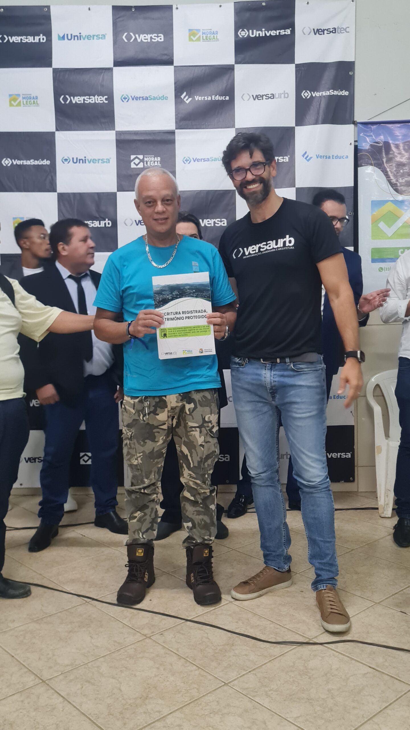 Mais de 100 famílias do bairro Dr. Eduardo receberam as escrituras dos seus lotes registradas em Cartório, sem custo algum. Os títulos de propriedade dos imóveis foram entregues na noite desta segunda-feira (dia 7) pela Prefeitura de Caratinga, em solenidade que lotou o auditório da Fundação Educacional Cidade dos Meninos (Funcime), no bairro Santa Cruz. Até agora, aproximadamente 200 famílias daquela comunidade já foram beneficiadas por meio do programa “Morar Legal”, executado pela empresa Versaurb.