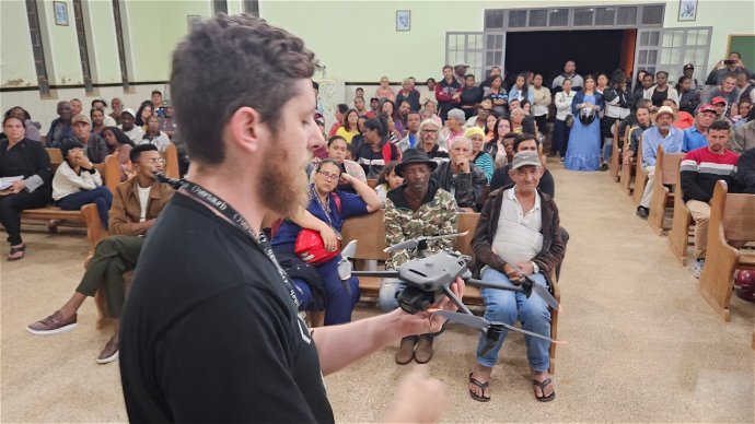Um drone chamou a atenção dos moradores da Portelinha, em Caratinga, nesta segunda-feira (dia 8). Teve gente que saiu de casa para acompanhar, no alto e no chão, o pequeno veículo aéreo não tripulado que, com seus voos, marcou o início da realização de um sonho antigo daquela comunidade: a regularização fundiária do loteamento criado em 2003 e a entrega de escrituras aos proprietários de lotes que, desde então, esperam por um documento oficial que comprove sua propriedade.